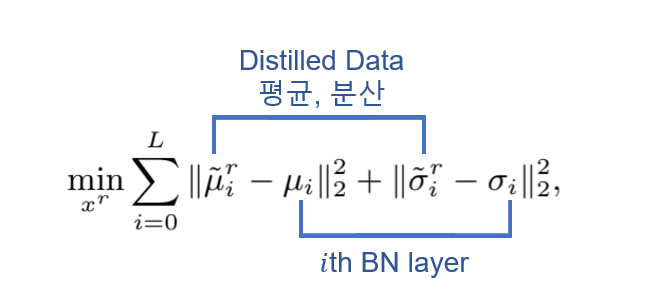 Distilled Data는 기존 데이터의 BN 레이어에 인코딩 된 statistic을 바탕으로 기존 데이터 분포와 유사하게 만든다.