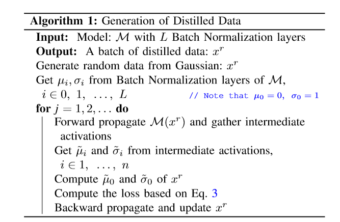 위의 과정 3-6을 여러 번 반복하면 최종적으로 기존 BN 레이어의 분포와 비슷한 새로운 Distilled dataset $x^r$를 구할 수 있다.