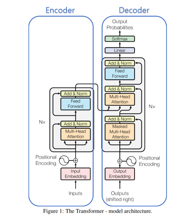 왼쪽 사진에서 input이 들어가는 왼쪽을 encoder block, ouput이 들어가는 오른쪽을 decoder block이라 하면 이 블락들은 각각 N개가 있다. (페이퍼에선 N=6)