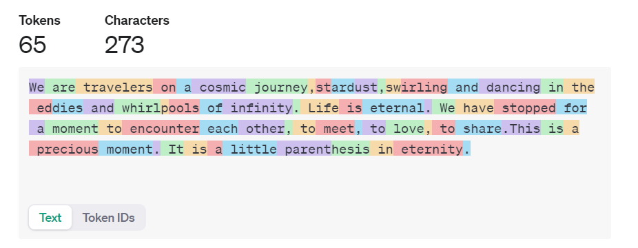 그래서 토큰의 수는 단어의 수보다 많다. 100 tokens $\simeq$ 75 words.